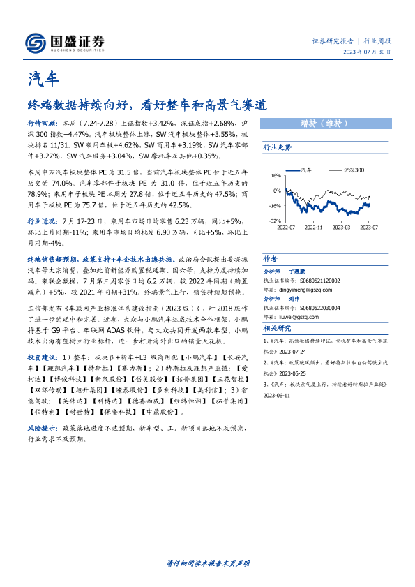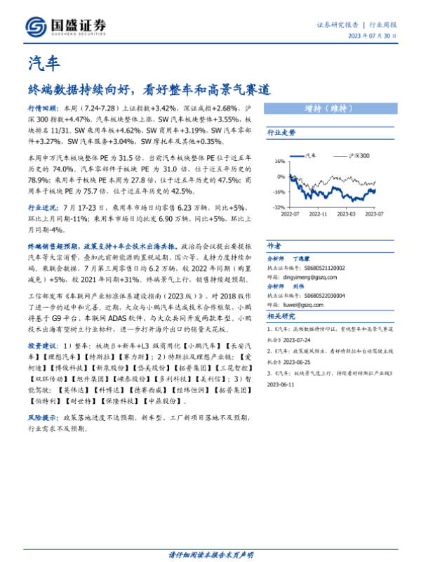 【国盛证券】【20230730】20230730-国盛证券-汽车行业周报:终端数据持续向好,看好整车和高景气赛道-20页