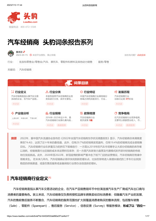 【头豹研究院】【20230731】汽车经销商 头豹词条报告系列-17页