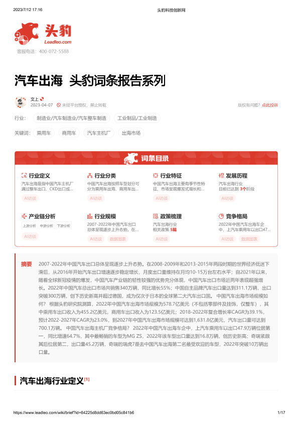 【头豹研究院】【20230712】汽车出海 头豹词条报告系列-17页