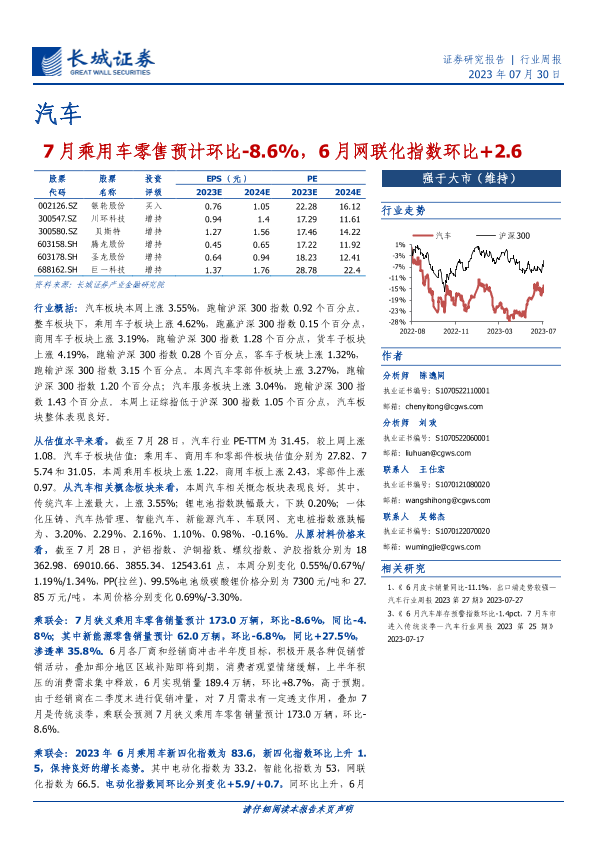 【长城证券】【20230730】20230730-长城证券-汽车行业周报:7月乘用车零售预计环比-8.6%,6月网联化指数环比+2.6-11页