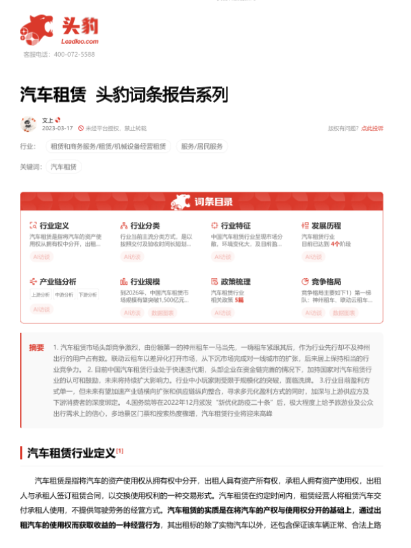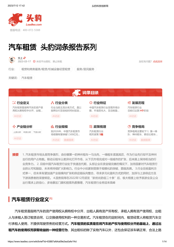 【头豹研究院】【20230802】汽车租赁 头豹词条报告系列-14页