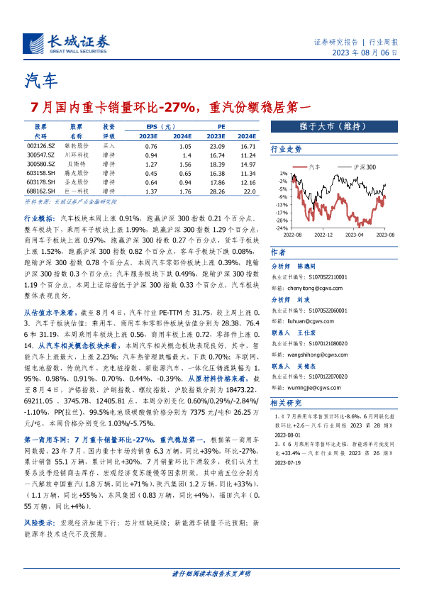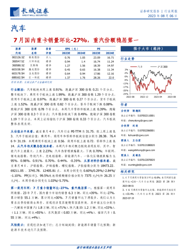 【长城证券】【20230806】20230806-长城证券-汽车行业周报:7月国内重卡销量环比-27%,重汽份额稳居第一-10页