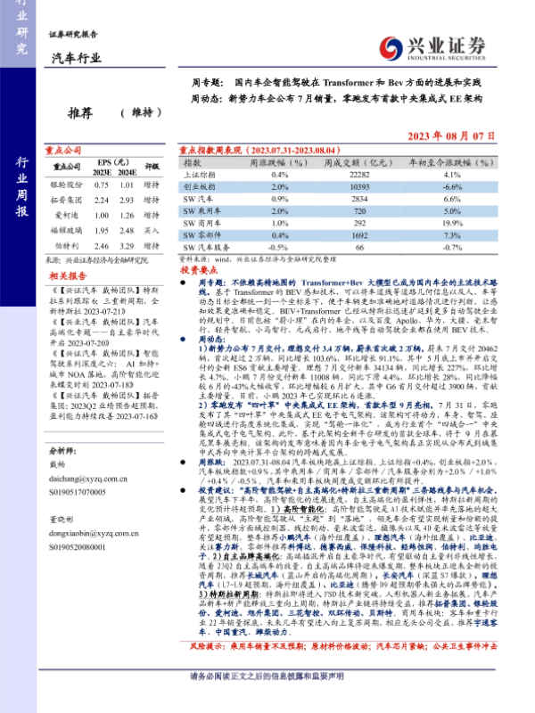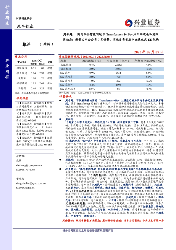 【兴业证券】【20230807】业证券-汽车行业周专题:国内车企智能驾驶在Transformer和Bev方面的进展和实践 周动态:新势力车企公布7月销量,零跑发布首款中央集成式EE架构-18页