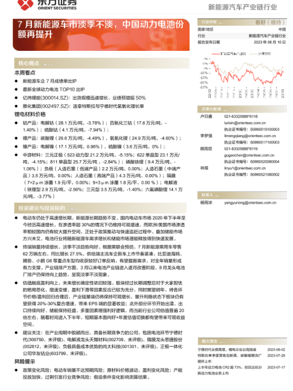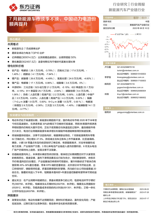 【东方证券】【20230810】20230810-东方证券-新能源汽车产业链行业行业周报:7月新能源车市淡季不淡,中国动力电池份额再提升-14页