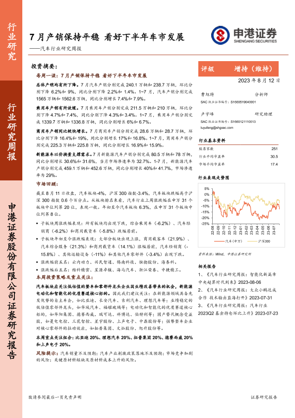 【申港证券】【20230812】20230812-申港证券-汽车行业研究周报:7月产销保持平稳 看好下半年车市发展-15页