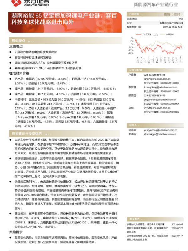 【东方证券】【20230814】20230814-东方证券-新能源汽车产业链行业周报:湖南裕能65亿定增加码锂电产业链,容百科技全球化战略进击海外-14页