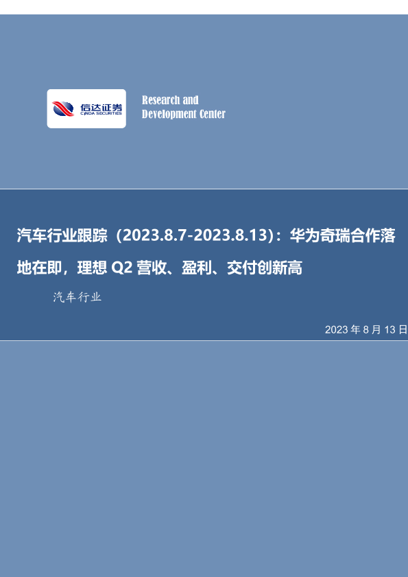 【信达证券】【20230813】20230813-信达证券-汽车行业跟踪:华为奇瑞合作落地在即,理想Q2营收、盈利、交付创新高-23页