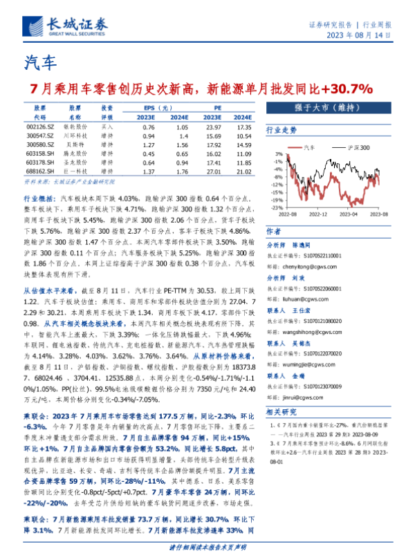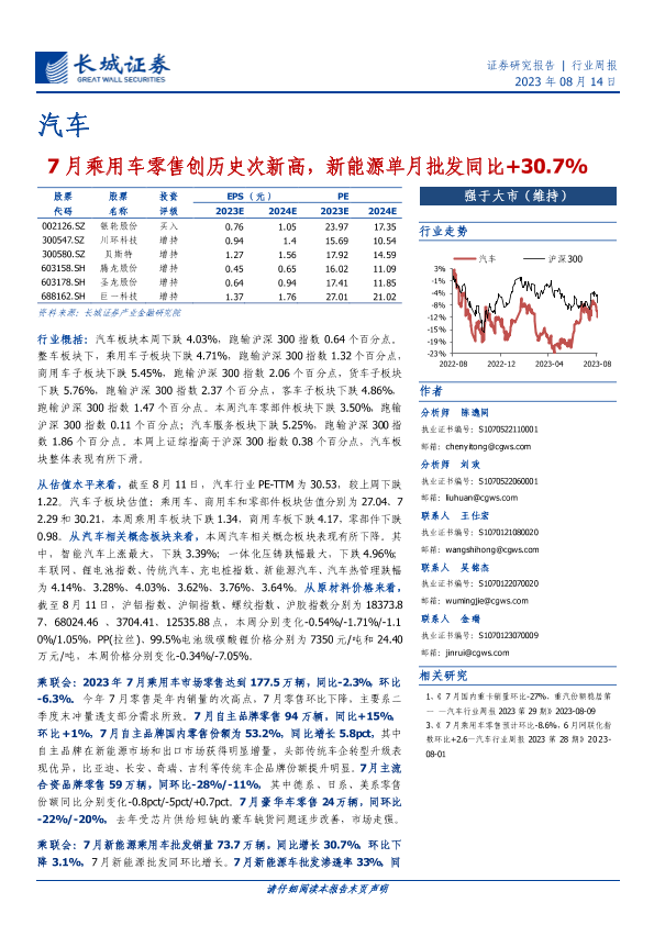 【长城证券】【20230814】20230814-长城证券-汽车行业周报:7月乘用车零售创历史次新高,新能源单月批发同比+30.7%-11页