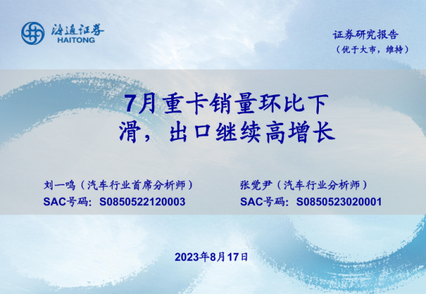 【海通证券】【20230817】7月重卡销量环比下滑,出口继续高增长-13页