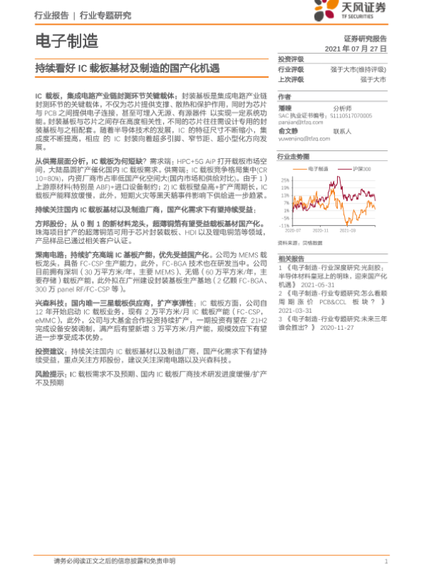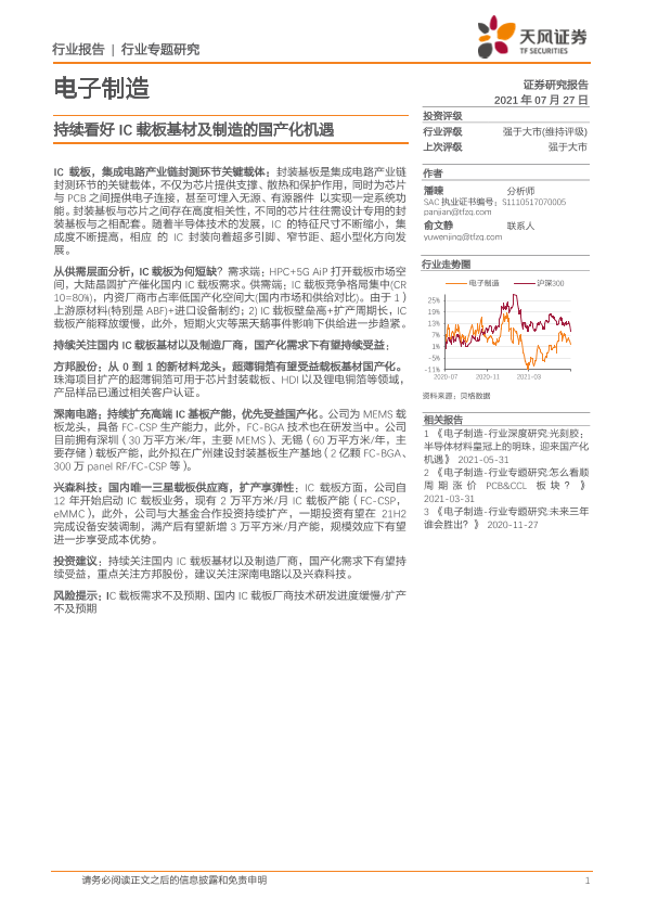 【天风证券】【20210727】电子制造行业专题研究:持续看好IC载板基材及制造的国产化机遇-19页