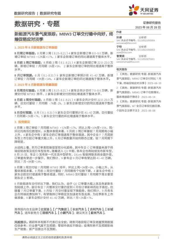 【天风证券】【20230828】新能源汽车行业景气度跟踪:M8W3订单交付稳中向好,终端促销应对淡季-14页