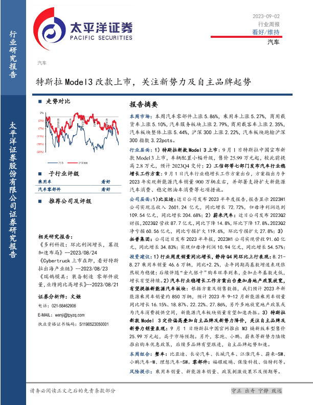 【太平洋证券】【20230902】20230902-太平洋-汽车行业周报:特斯拉Model3改款上市,关注新势力及自主品牌起势-19页