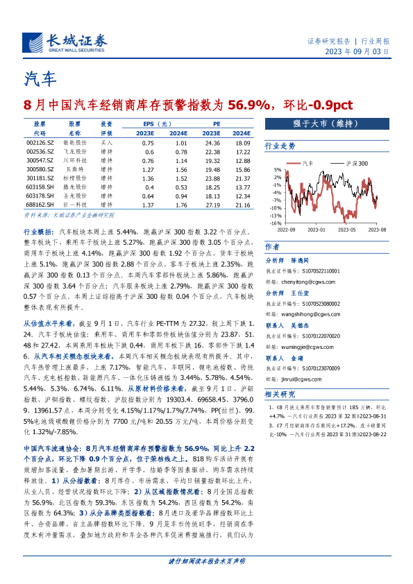 【长城证券】【20230903】20230903-长城证券-汽车行业周报:8月中国汽车经销商库存预警指数为56.9%,环比-0.9pct-13页
