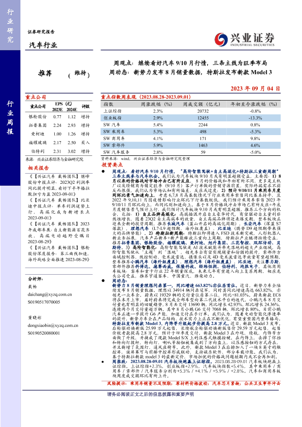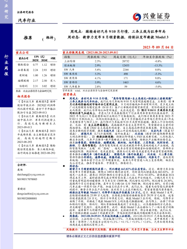 【兴业证券】【20230904】20230904-兴业证券-汽车行业周观点:继续看好汽车9 10月行情,三条主线为旺季布局 周动态:新势力发布8月销量数据,特斯拉发布新款Model 3-16页