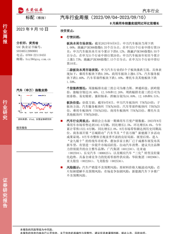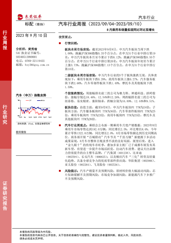 【东莞证券】【20230910】20230910-东莞证券-汽车行业周报:8月乘用车销量实现同比环比双增长-11页