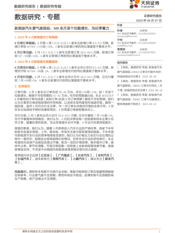 【天风证券】【20230907】新能源汽车景气度跟踪:M8全月呈个位数增长,为旺季蓄力-14页