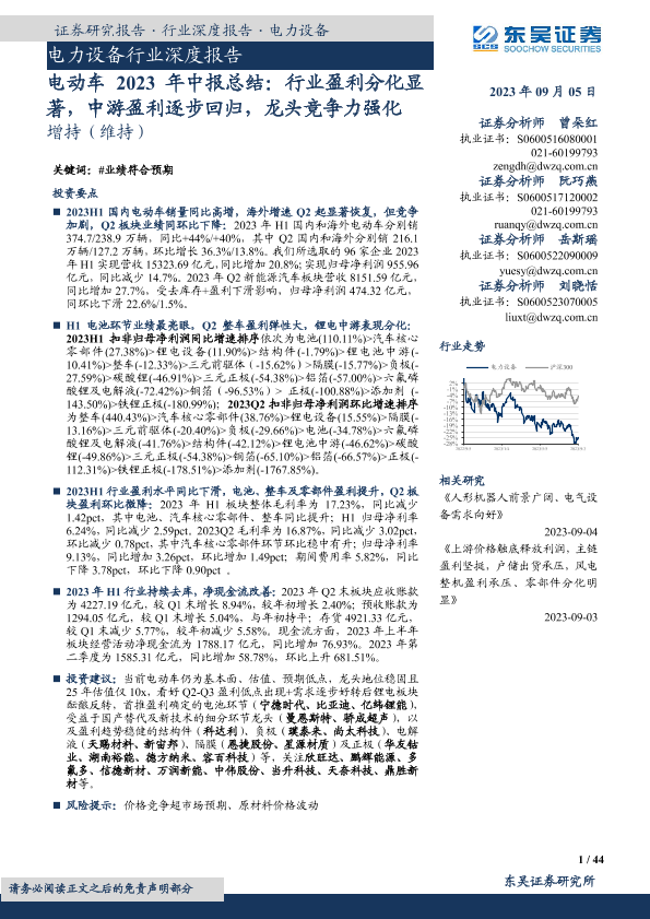 【东吴证券】【20230905】电动车2023年中报总结:行业盈利分化显著,中游盈利逐步回归,龙头竞争力强化-44页