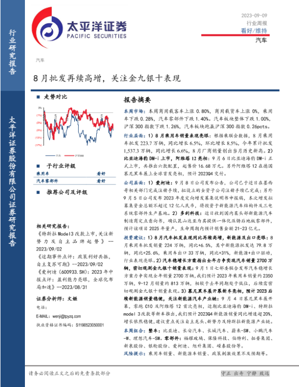 【太平洋证券】【20230909】20230909-太平洋-汽车行业周报:8月批发再续高增,关注金九银十表现-18页