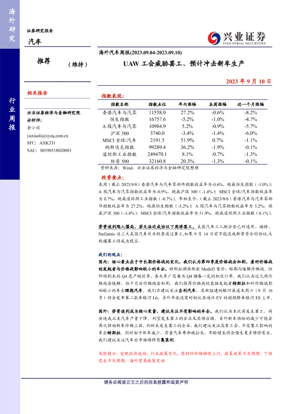 【兴业证券】【20230910】UAW工会威胁罢工、预计冲击新车生产-26页