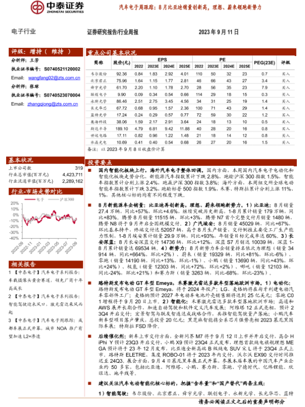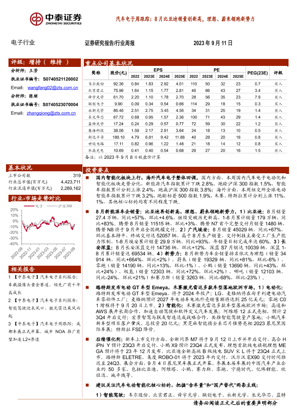 【中泰证券】【20230911】汽车电子周跟踪:8月比亚迪销量创新高,理想、蔚来领跑新势力-17页