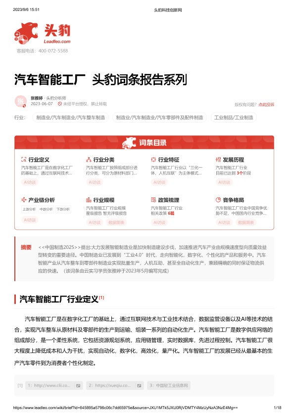 【头豹研究院】【20230913】汽车智能工厂 头豹词条报告系列-18页