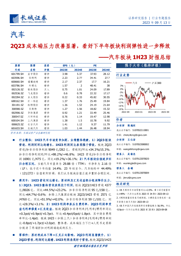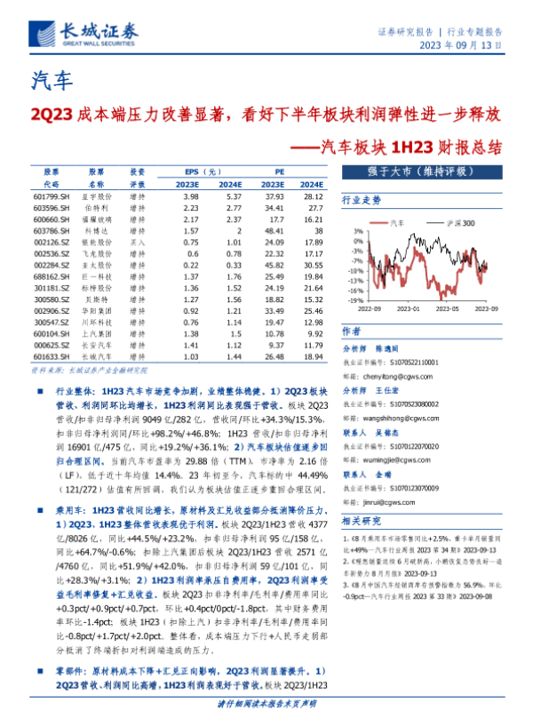 【长城证券】【20230913】汽车板块1H23财报总结:2Q23成本端压力改善显著,看好下半年板块利润弹性进一步释放-26页