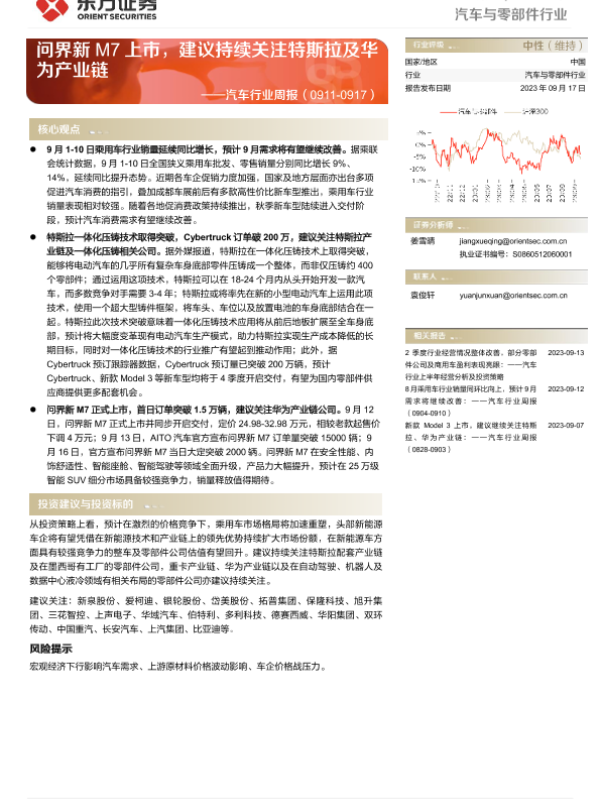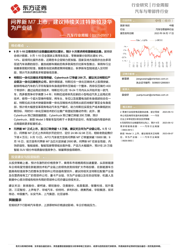 【东方证券】【20230917】20230917-东方证券-汽车行业周报:问界新M7上市,建议持续关注特斯拉及华为产业链-18页