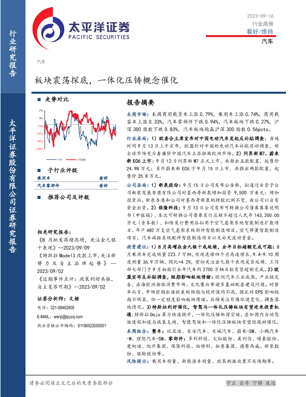 【太平洋证券】【20230916】20230916-太平洋-汽车行业周报:板块震荡探底,一体化压铸概念催化-23页