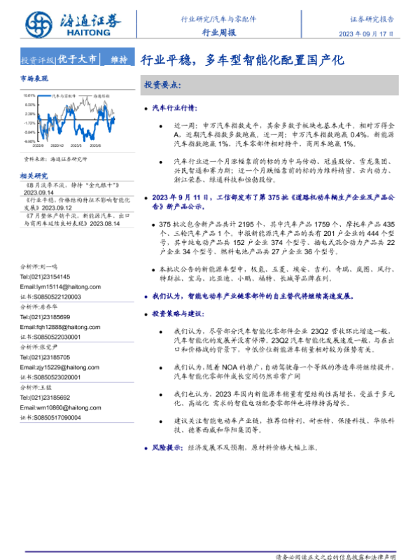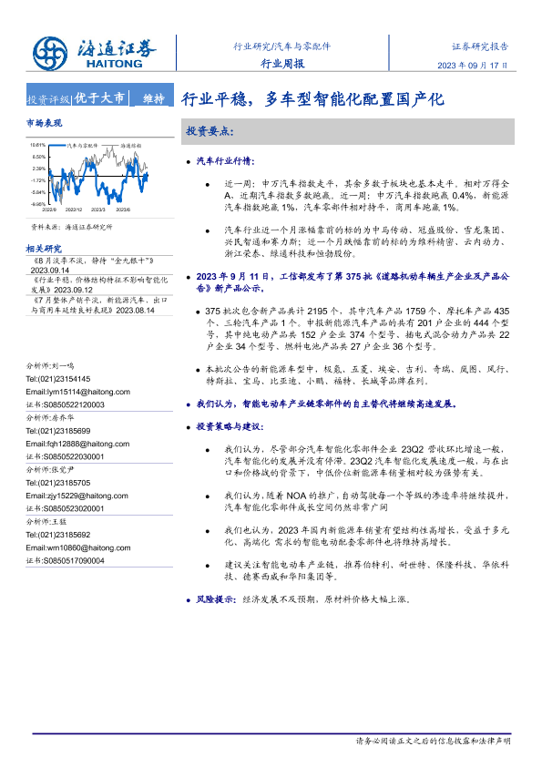 【海通证券】【20230917】汽车与零配件行业周报:行业平稳,多车型智能化配置国产化-5页