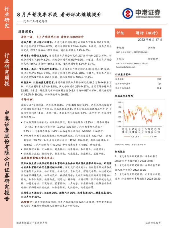 【申港证券】【20230917】20230917-申港证券-汽车行业研究周报:8月产销淡季不淡 看好环比继续提升-15页