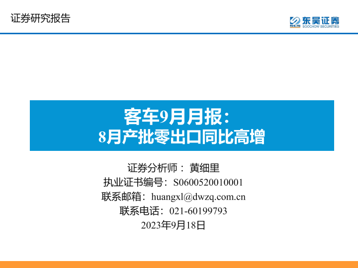 【东吴证券】【20230918】客车9月月报:8月产批零出口同比高增-17页