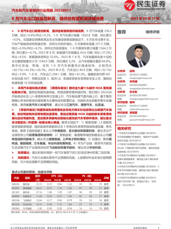 【民生证券】【20230917】汽车和汽车零部件行业周报:8月汽车出口销量创新高,强供给有望刺激终端消费-15页