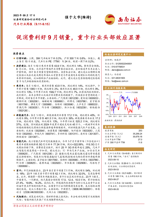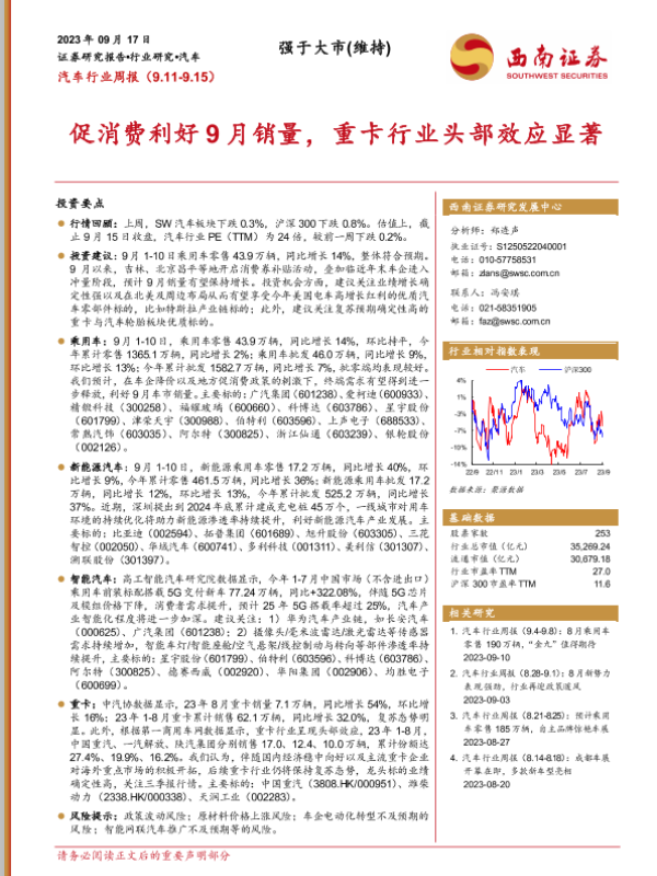 【西南证券】【20230917】20230917-西南证券-汽车行业周报:促消费利好9月销量,重卡行业头部效应显著-18页