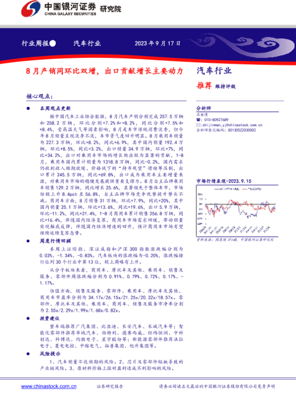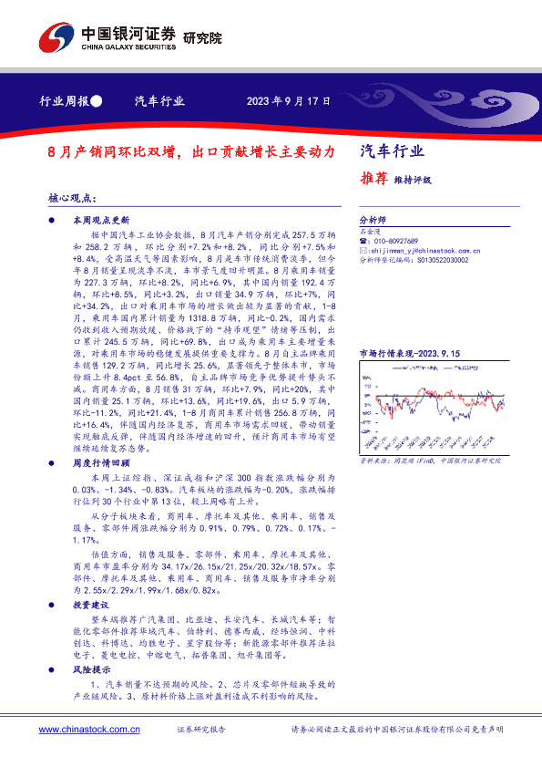 【银河证券】【20230917】20230917-中国银河-汽车行业行业周报:8月产销同环比双增,出口贡献增长主要动力-13页