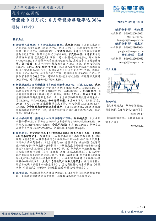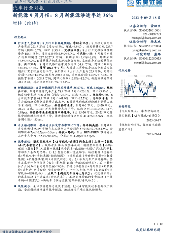 【东吴证券】【20230918】汽车行业月报:新能源9月月报:8月新能源渗透率达36%-12页