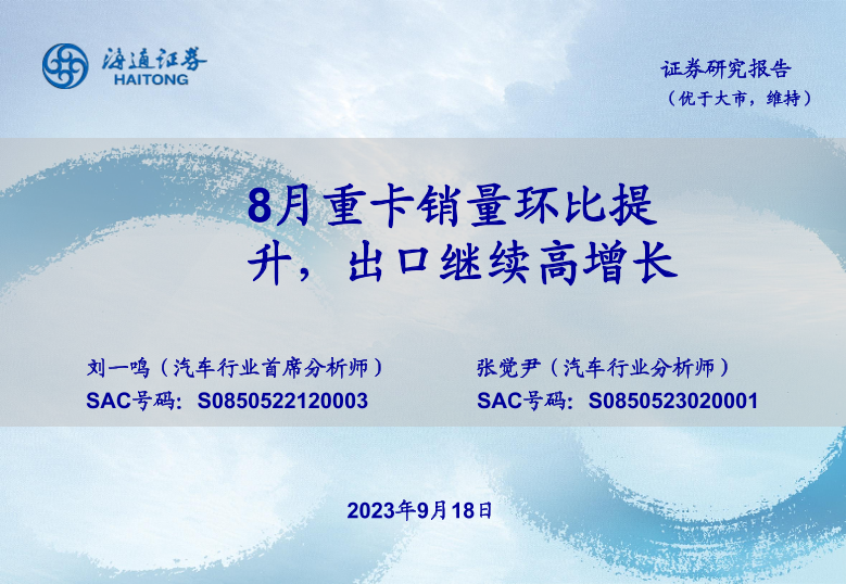 【海通证券】【20230918】8月重卡销量环比提升,出口继续高增长-14页