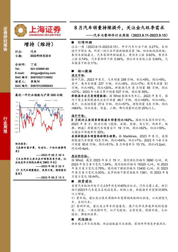 【上海证券】【20230920】20230920-上海证券-汽车与零部件行业周报:8月汽车销量持续提升,关注金九旺季需求-13页