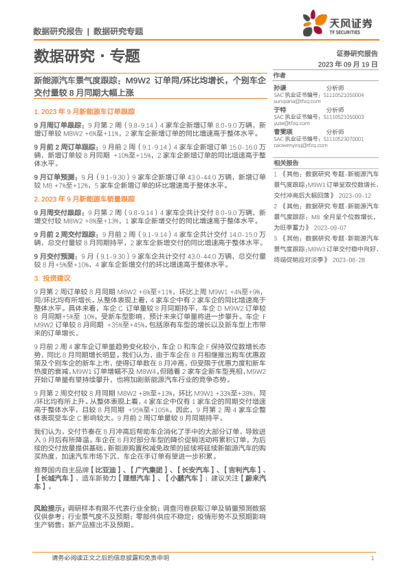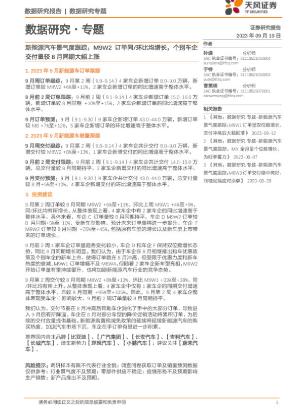 【天风证券】【20230919】新能源汽车景气度跟踪:M9W2订单同环比均增长,个别车企交付量较8月同期大幅上涨-13页