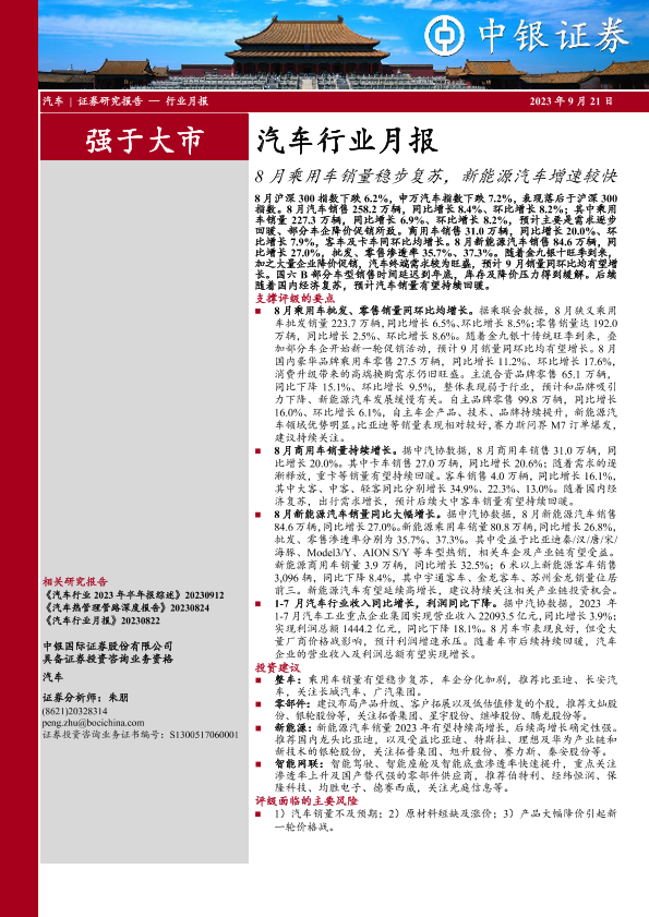 【中银证券】【20230921】20230921-中银证券-汽车行业月报:8月乘用车销量稳步复苏,新能源汽车增速较快-15页