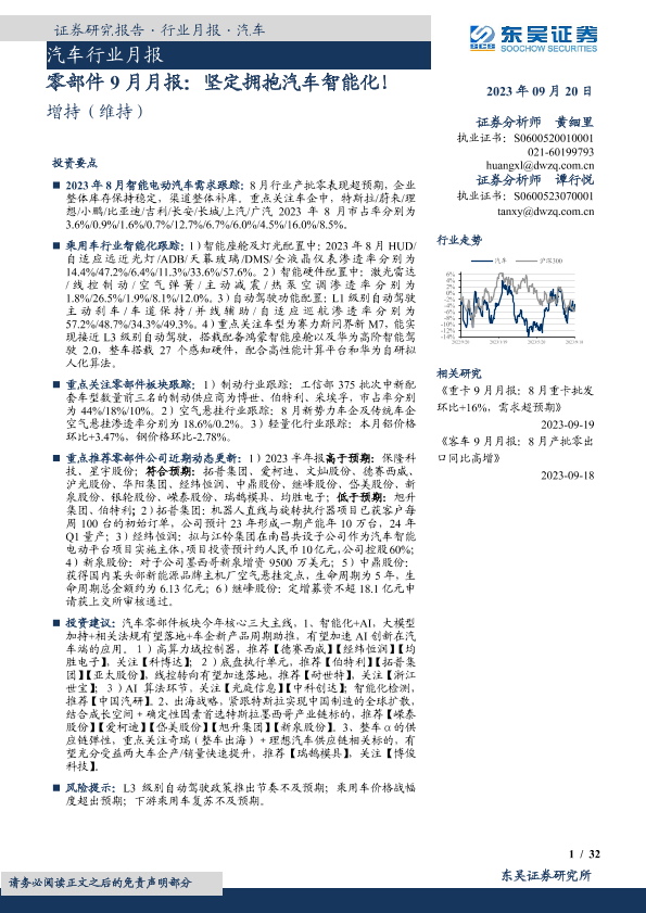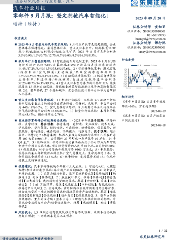 【东吴证券】【20230920】零部件9月月报:坚定拥抱汽车智能化!-32页