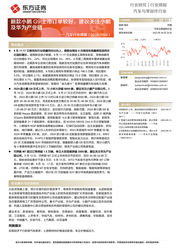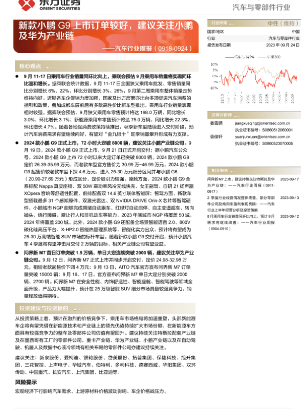 【东方证券】【20230924】20230924-东方证券-汽车行业周报:新款小鹏G9上市订单较好,建议关注小鹏及华为产业链-20页