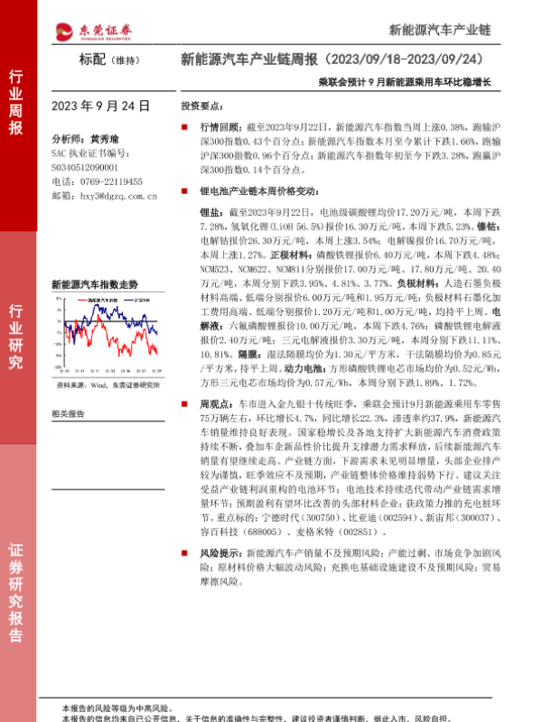【东莞证券】【20230924】20230924-东莞证券-新能源汽车产业链周报:乘联会预计9月新能源乘用车环比稳增长-13页