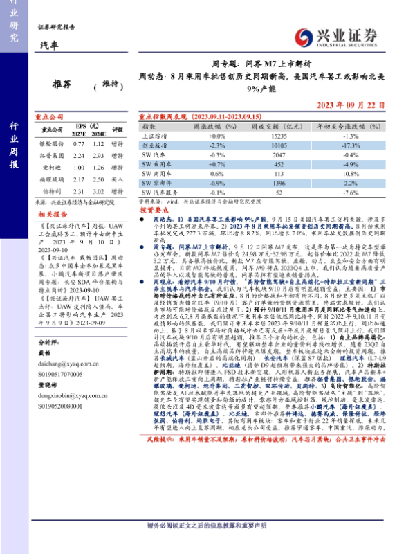 【兴业证券】【20230922】周专题:问界M7上市解析 周动态:8月乘用车批售创历史同期新高,美国汽车罢工或影响北美9%产能-17页