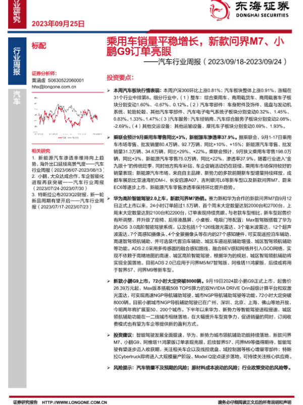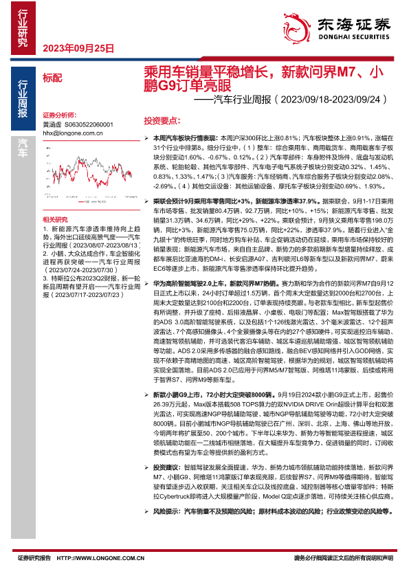 【东海证券】【20230925】乘用车销量平稳增长,新款问界M7、小鹏G9订单亮眼-13页