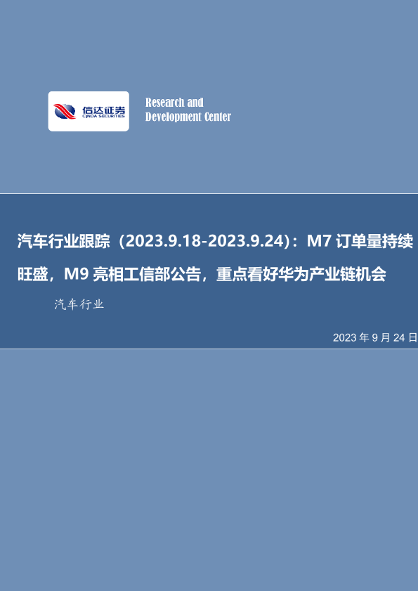 【信达证券】【20230924】汽车行业跟踪:M7订单量持续旺盛,M9亮相工信部公告,重点看好华为产业链机会-24页