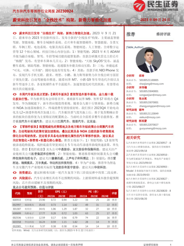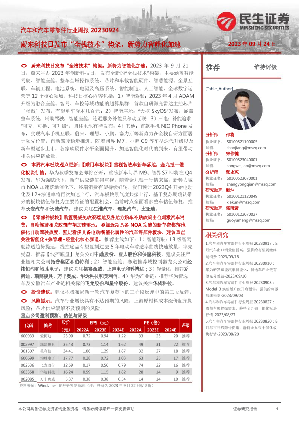【民生证券】【20230924】汽车和汽车零部件行业周报:蔚来科技日发布“全栈技术”构架,新势力智能化加速-18页