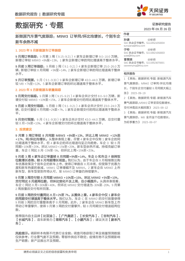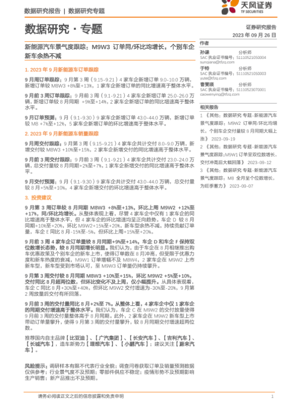 【天风证券】【20230926】新能源汽车景气度跟踪:M9W3订单同环比均增长,个别车企新车余热不减-14页