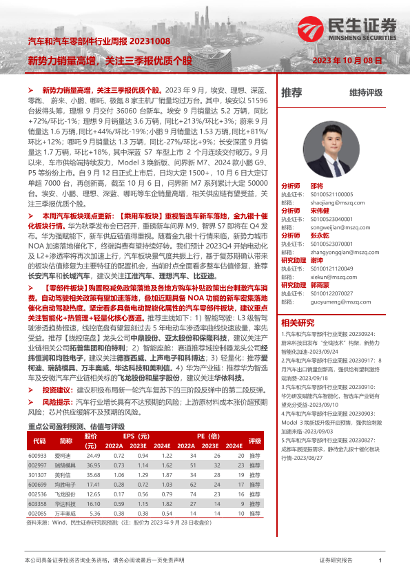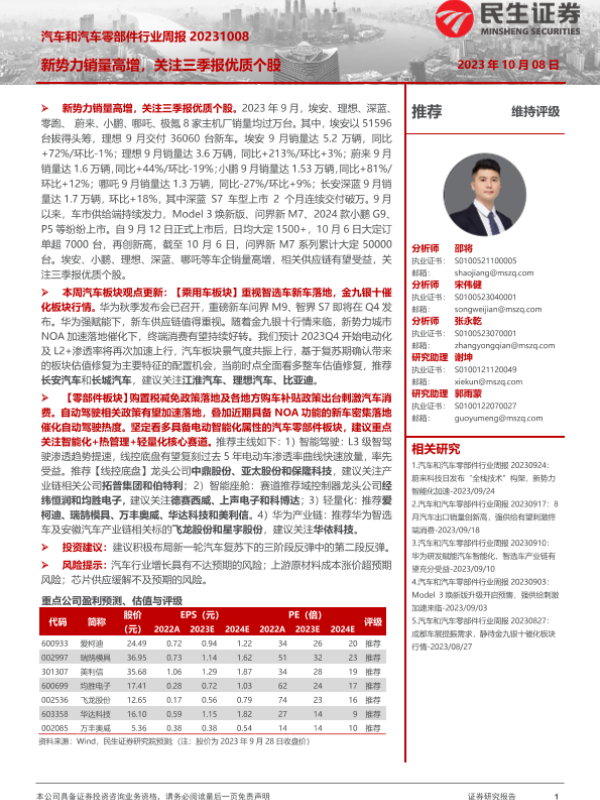 【民生证券】【20231008】汽车和汽车零部件行业周报:新势力销量高增,关注三季报优质个股-16页