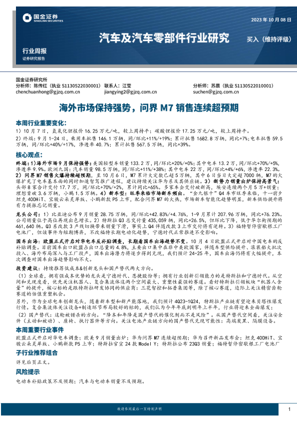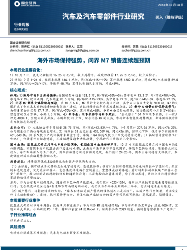 【国金证券】【20231008】汽车及汽车零部件行业研究:海外市场保持强势,问界M7销售连续超预期-16页