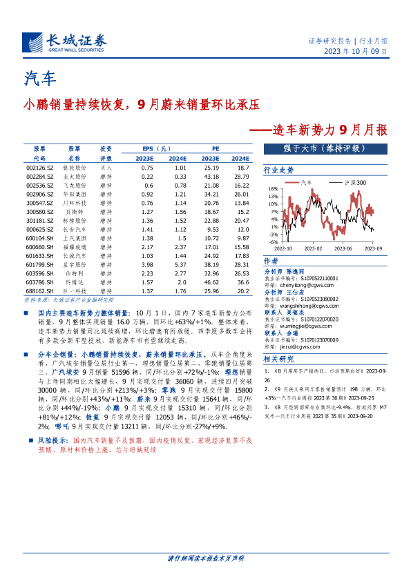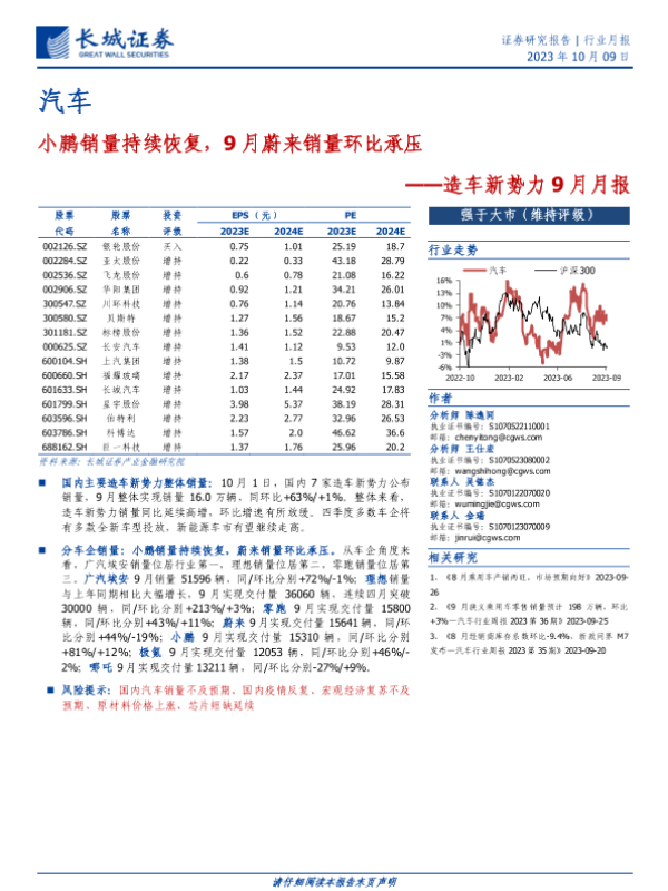 【长城证券】【20231009】20231009-长城证券-造车新势力9月月报:小鹏销量持续恢复,9月蔚来销量环比承压-10页